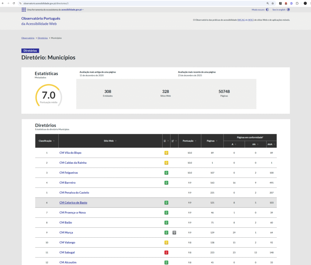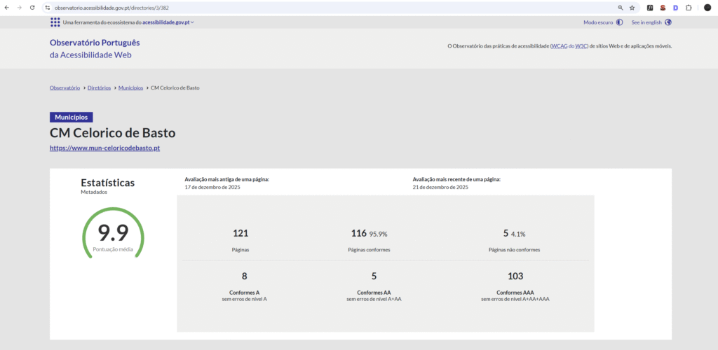 Como resultado das intervenções realizadas, a Declaração de Acessibilidade do site foi validada como Plenamente Conforme, tendo o portal municipal alcançado a pontuação de 9,9 pontos em 10 possíveis, no Observatório Nacional da Acessibilidade, assumindo uma posição de destaque a nível nacional entre os sites das autarquias avaliadas (6º lugar em 328 sites de municípios avaliados). Consulte os dados do Observatório AQUI.